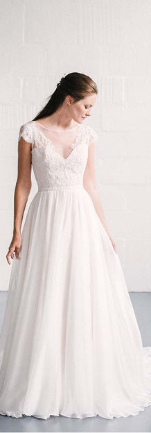 Elegant and effortless, the Aurora gown is designed for a wild romantic bride. A soft golden shell hue, this strapless dress brings a subtle warmth to the skin. With a soft satin crepe sweetheart bodice and flowing silk chiffon skirt, this gown can be worn alone as strapless or paired with the boat neck, V-back Aurora jacket which is finished with delicate capped sleeves.